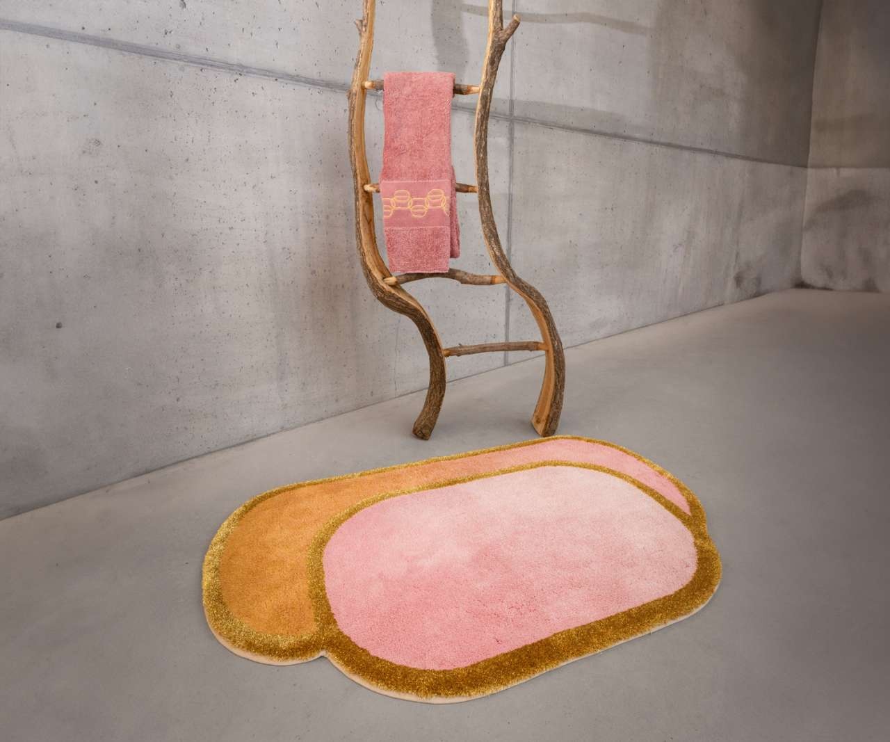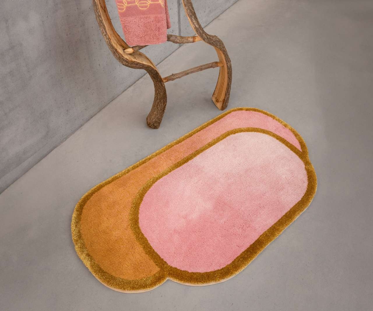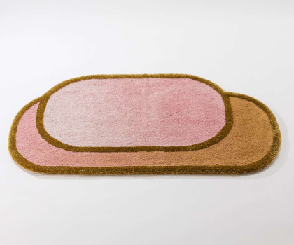 Het ontwerp speelt met zachte roze nuances en subtiele gouden accenten, versterkt door de fijne glans van Lurex-garens. Deze verfijnde details geven de mat een elegante uitstraling die doet denken aan haute couture – warm, luxueus en met oog voor perfectie.