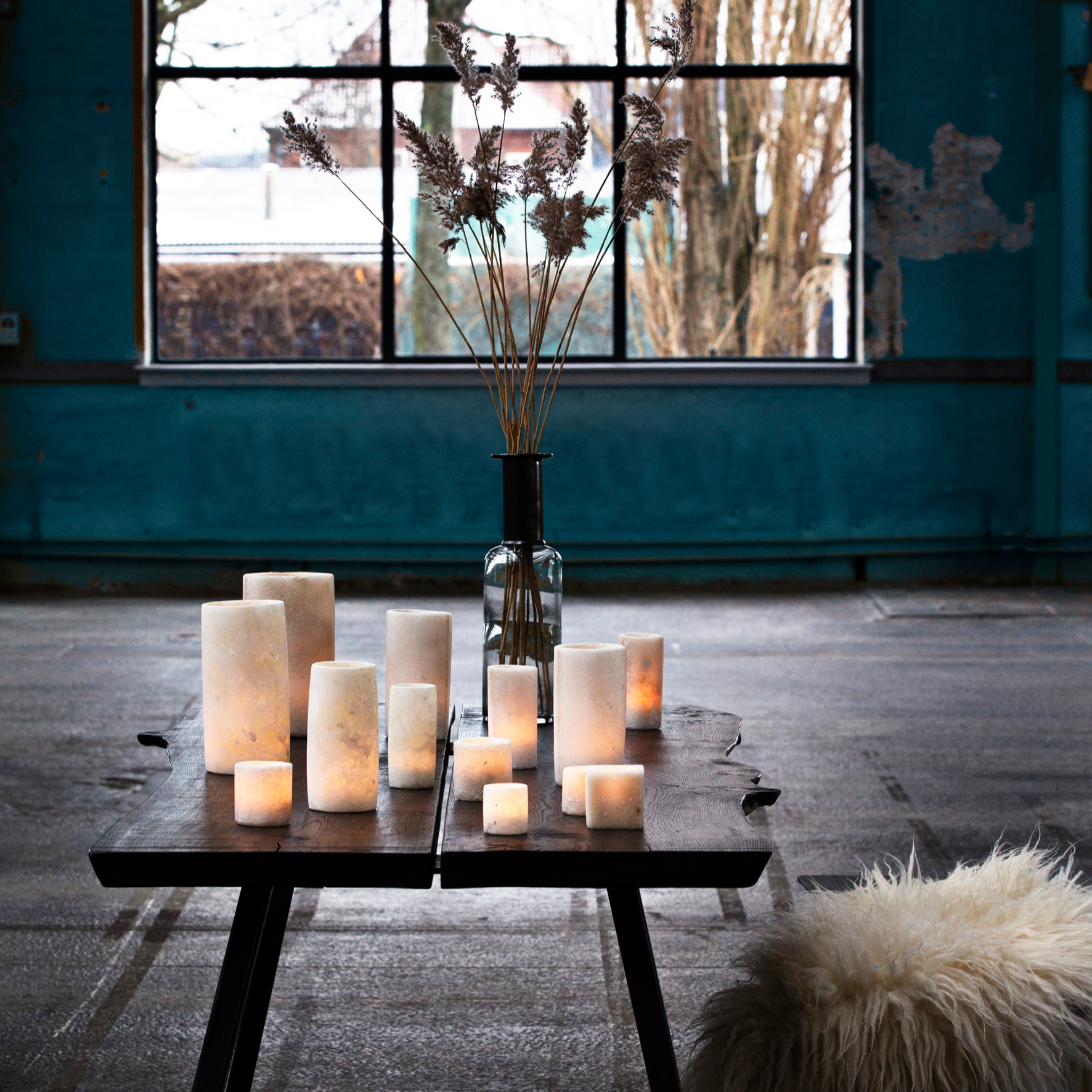 Sirocco albasten kaarshouder – handgemaakt uit helder wit albast met cilindervormig design. Het kaarslicht straalt zacht door de steen heen. Beschikbaar bij Marie-Julliette.